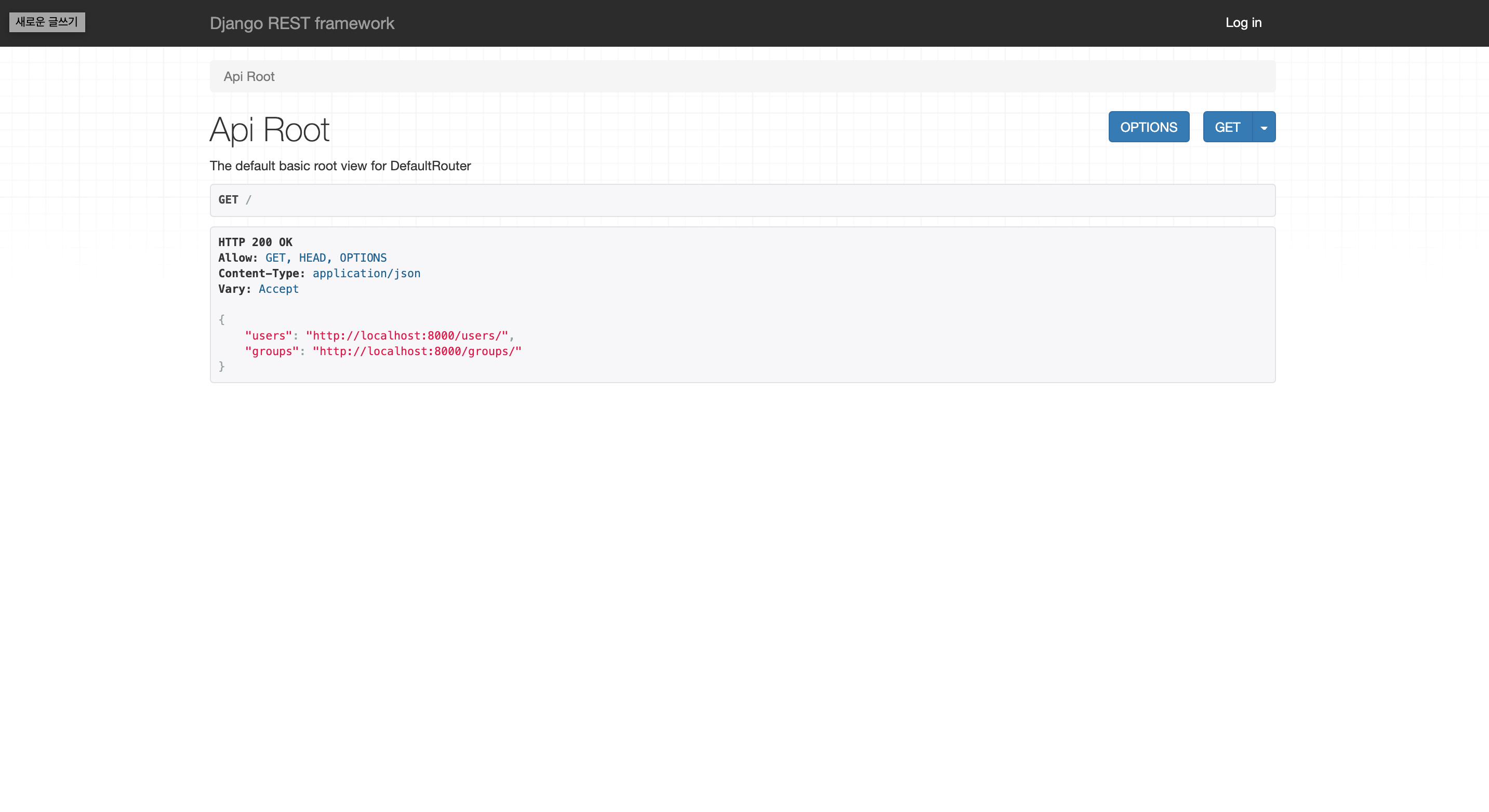 DefaultRouter를 사용하여 users와 groups의 데이터를 담을 url을 router에 등록하였습니다.