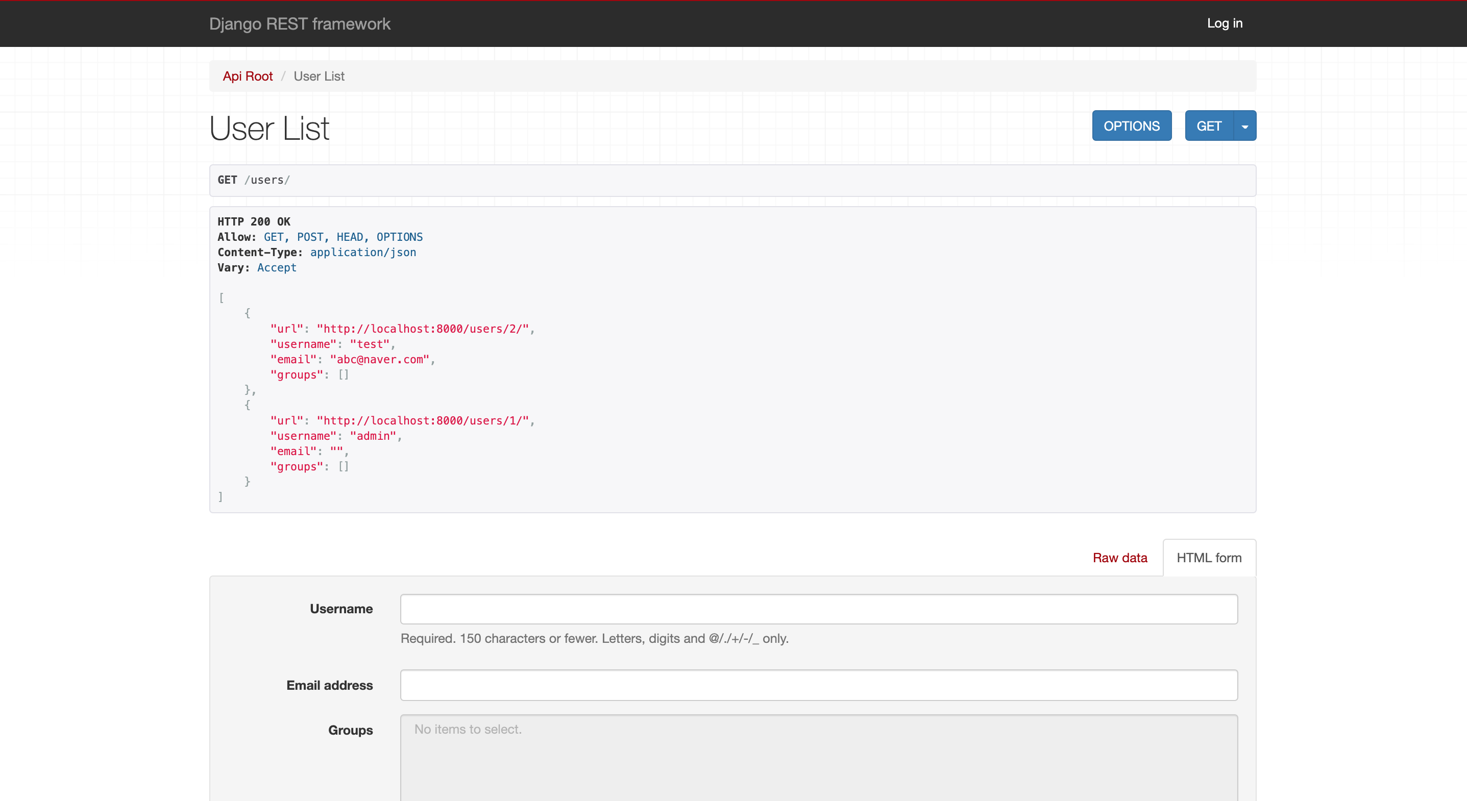이 코드에서는 User모델이 가지고있는 'url', 'username', 'email', 'groups'가 직렬화 되도록 작성이 됬습니다.